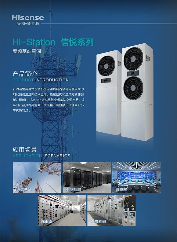針對運營商基站設(shè)備機房空調(diào)能耗占總耗電量較大的現(xiàn)狀,海信通過新技術(shù)運用,通過結(jié)構(gòu)和送風(fēng)方式的創(chuàng)新,研制HI-Station信悅系列變頻基站空調(diào)產(chǎn)品